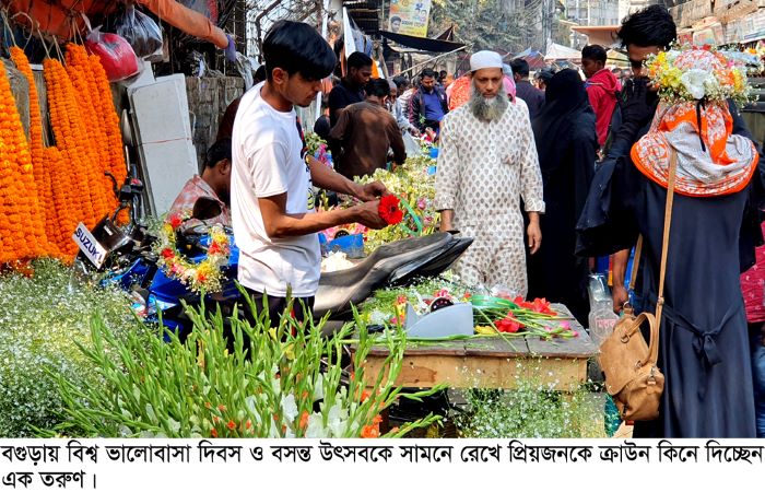 বগুড়া জেলা ফুল ব্যবসায়ী সমিতির সাধারণ সম্পাদক ও করতোয়া ফুলঘরের মালিক লক্ষণ দাস অমিত বলেন, তারা ১৭ জন এখানে ফুল কেনাবেচা করেন। সারাবছর ফুল বিক্রি হলেও বিশেষ দিবস ও উৎসবকে সামনে রেখে ভারত, যশোহরের গদাখালি, কালিগঞ্জসহ বিভিন্ন মোকাম থেকে ফুল আনা হয়। এবার মোকামে দাম বেশি হওয়ায় প্রতিটি দোকানে গত বছরের চেয়ে কম ফুল তোলা হয়েছে। গত বছর গড়ে ৭ থেকে ১০ হাজার থাই লাল গোলাপ তোলা হলেও এবার অর্ধেক। তিনি ছাড়াও লাভলী ফুলঘরের মালিক বাবলু শেখ জানান, একদিকে ফুলের দাম চড়া এবং অন্যদিকে বসন্ত উৎসব ও ভালোবাসা দিবস একদিনে হওয়ায় এবার তাদের ব্যবসা মন্দা যাবে। তারা অর্ধকোটি টাকার ব্যবসার টার্গেট করলেও পূরণ না হবার আশংকা করছেন। তারা আরো জানান, এ দুটি উৎসবে ব্যবসা মন্দা গেলেও আসন্ন আন্তর্জাতিক মাতৃভাষা দিবসে ভালো ব্যবসা করবেন বলে আশা করেন।