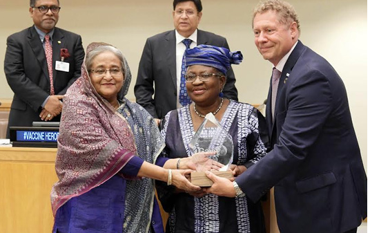 টিকা দান কর্মসূচিতে বাংলাদেশের অসামান্য সাফল্যের স্বীকৃতি স্বরূপ প্রধানমন্ত্রী শেখ হাসিনাকে মর্যাদাপূর্ণ ‘ভ্যাকসিন হিরো’ পুরস্কারে ভূষিত করা হয়েছে। সুইজারল্যান্ড ভিত্তিক বিশ্বব্যাপী টিকা দান সংস্থা গ্লোবাল অ্যালায়েন্স ফর ভ্যাকসিনেশন এবং ইমিউনাইজেশন