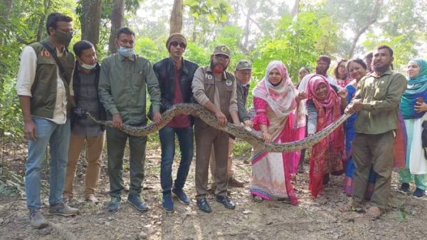 বাংলা হেডলাইনস রাঙ্গামাটি প্রতিনিধি: কাপ্তাইয়ে স্থানীয়দের হাতে ধরা পড়েছে বিশালাকৃতির ১৫ ফুট দৈর্ঘ্যে অজগর সাপ। যার ওজন প্রায় ২০ থেকে ২২ কেজি। বুধবার (২২ ডিসেম্বর) সকাল ৮টার দিকে কাপ্তাই উপজেলার