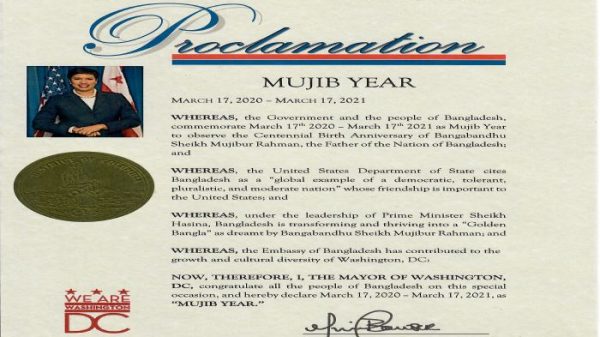 বাংলা হেডলাইনস: জাতির জনক বঙ্গবন্ধু শেখ মুজিবুর রহমানের জন্মশতবার্ষিকী উদযাপন উপলক্ষে যুক্তরাষ্ট্রের রাজধানী ওয়াশিংটন ডি.সি.’র মেয়র আগামী ১৭ই মার্চ ২০২০ থেকে ১৭ মার্চ ২০২১ পর্যন্ত বছরব্যাপী মুজিববর্ষ ঘোষণা করেছে। ডি.সি.’র