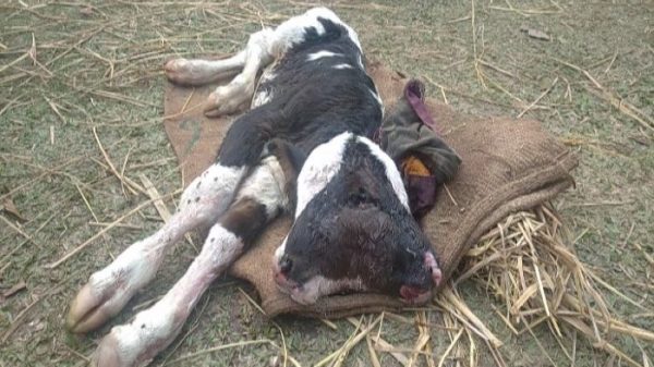 বাংলা হেডলাইনস কুড়িগ্রাম প্রতিনিধি : কুড়িগ্রাম সদর উপজেলার বেলগাছা ইউনিয়নের খলিলগঞ্জ এলাকা সংলগ্ন কালে গ্রামে দুই মাথা ও চার চোখ বিশিষ্ট একটি অস্বাভাবিক বকনা বাছুর প্রসব করেছে একটি গাভী। আজ